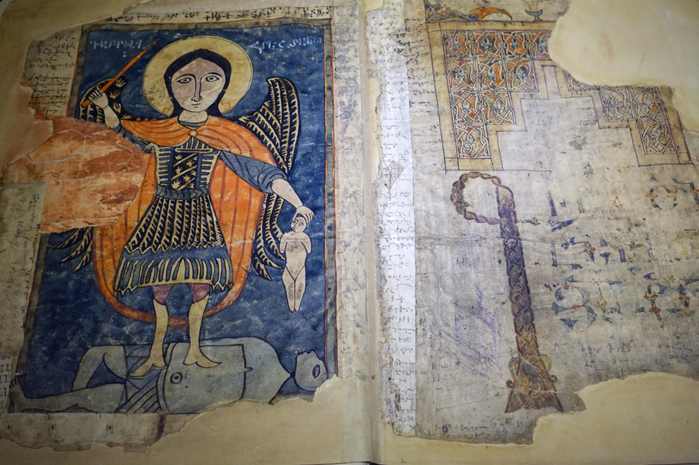 亞美尼亞使徒教會是世界上最古老的基督教國家教會,他們聲稱是耶穌門徒巴多羅買和達陡到來傳教時建立的。當地國王約在公元三百年轉信基督宗教,比羅馬帝國的君士坦丁大帝信教還要早。今次展出的古老手抄本,跟其他留存下來的經文卷一樣是寫在動物皮毛上的。有些加插了繪畫,以隱喻方式表達宗教思想。譬如一幅描繪天使長加百列的圖畫,其右手持短矛,左手抓着一個四肢截斷的小人,雙腳站在一個已死去的藍色人身上,造型與一般常見的加百列畫像不同。亞美尼亞人過去經常帶經文手抄本上戰場,此圖像相信是用來增加他們殺敵的信心。