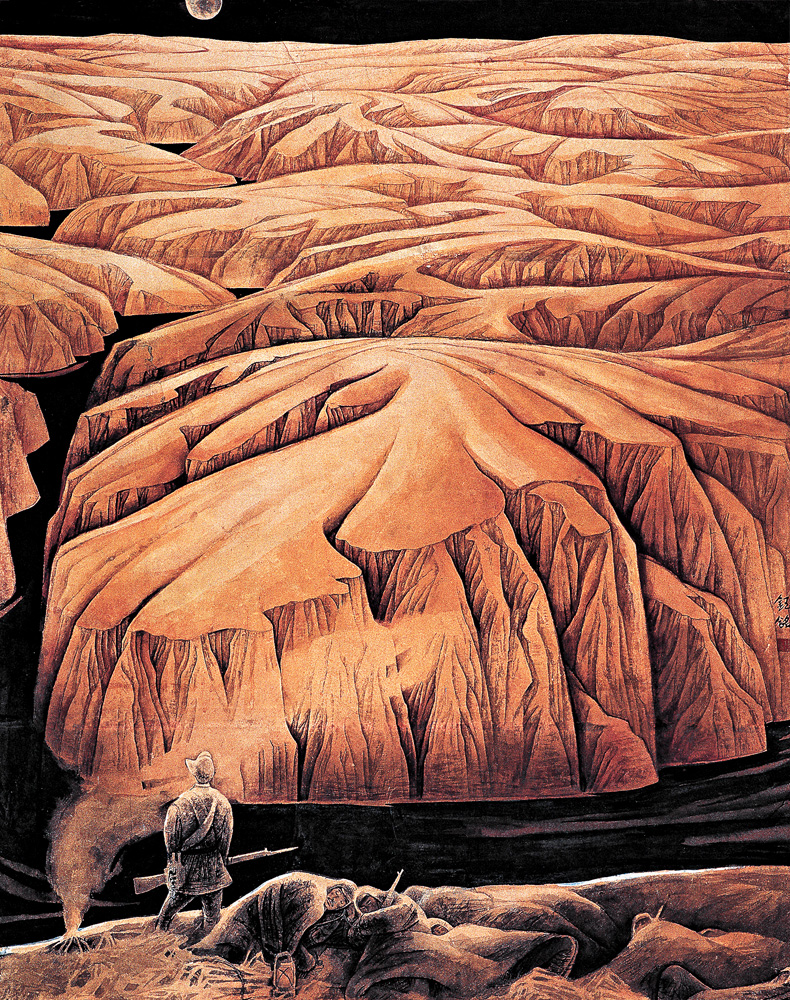 陳鈺銘一旦畫起畫來就什麼都顧不上了,譬如他會在深夜躲在廁所裏畫畫,又譬如他曾經走幾十公里山路,只為去到心儀的地方寫生。某次,他忽然想去陝西榆林寫生,從地圖上看了大致方位,發現榆林離部隊所在地不過短短一段距離,不想地圖上的短短一段竟有九十公里之多。隨手拿了幾個饅頭和鹹鴨蛋就匆忙出行的陳鈺銘走了大半天,一直走到天色暗下來。他又急又睏,正在絕望的時候,忽然見到遠處一幅極壯闊的景象。