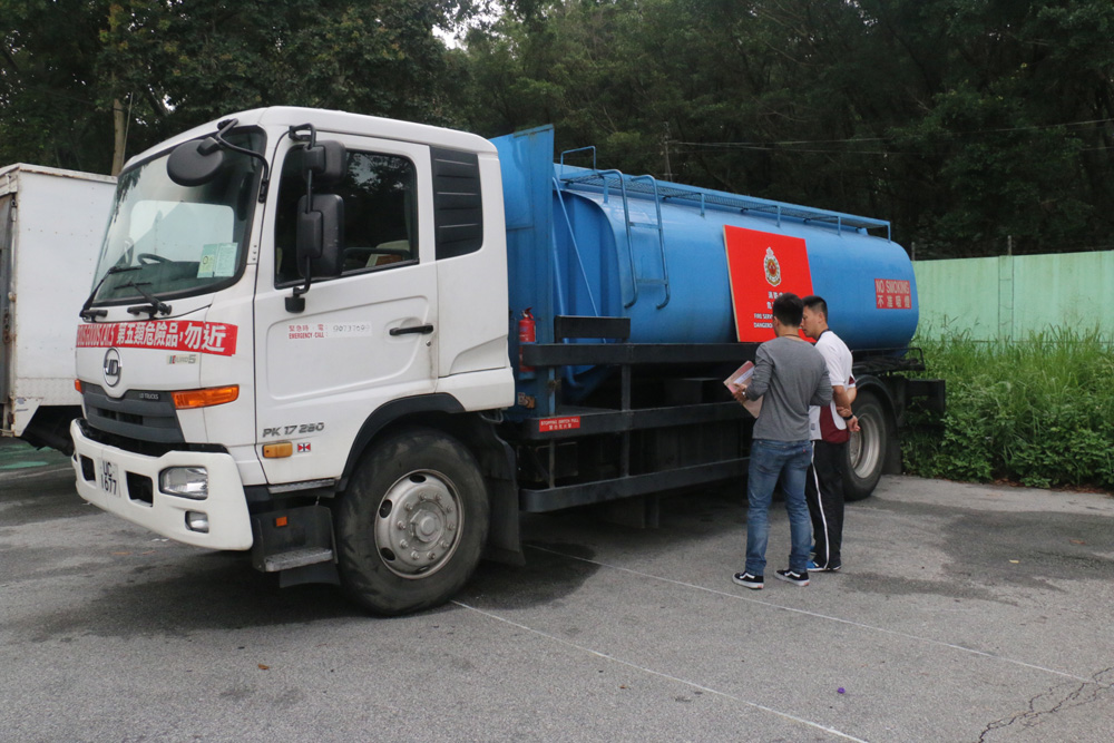 圖:消防處聯同警方在大埔工業邨搗破一個非法流動加油站,並扣查一輛涉案油缸車 大公報記者周慶邦攝