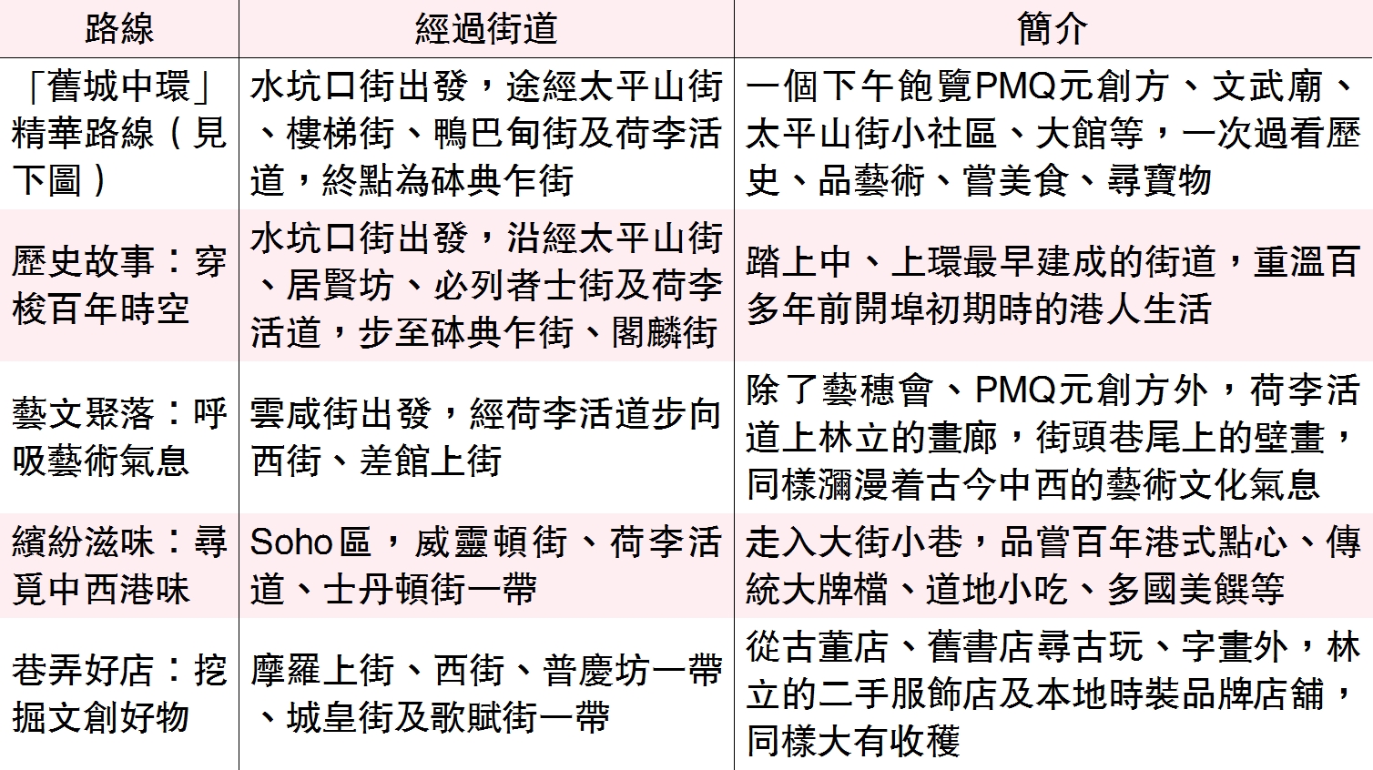 五條路線以荷李活道做核心,東至雲咸街起、南至堅道、西至水坑口街、北至皇后大道中。行一轉滿足晒你吃喝玩樂嘅願望,想睇香港一百五十幾年殖民地留痕,由水坑口街行向砵典乍街。有份籌辦導賞團嘅「活現香港」共同創辦人陳智遠話,「紅磚配綠瓦嘅香港中華基督教青年會會所,由芝加哥華人設計,但隔壁嘅樓梯街連接嘅,係起咗超過150年嘅文武廟」,中西合璧嘅畫面,香港獨有!