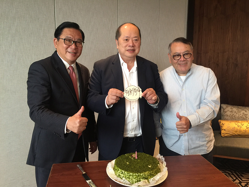 圖:林健鋒(左)和石禮謙(右)為張華峰(中)慶生/大公報記者石璐杉攝