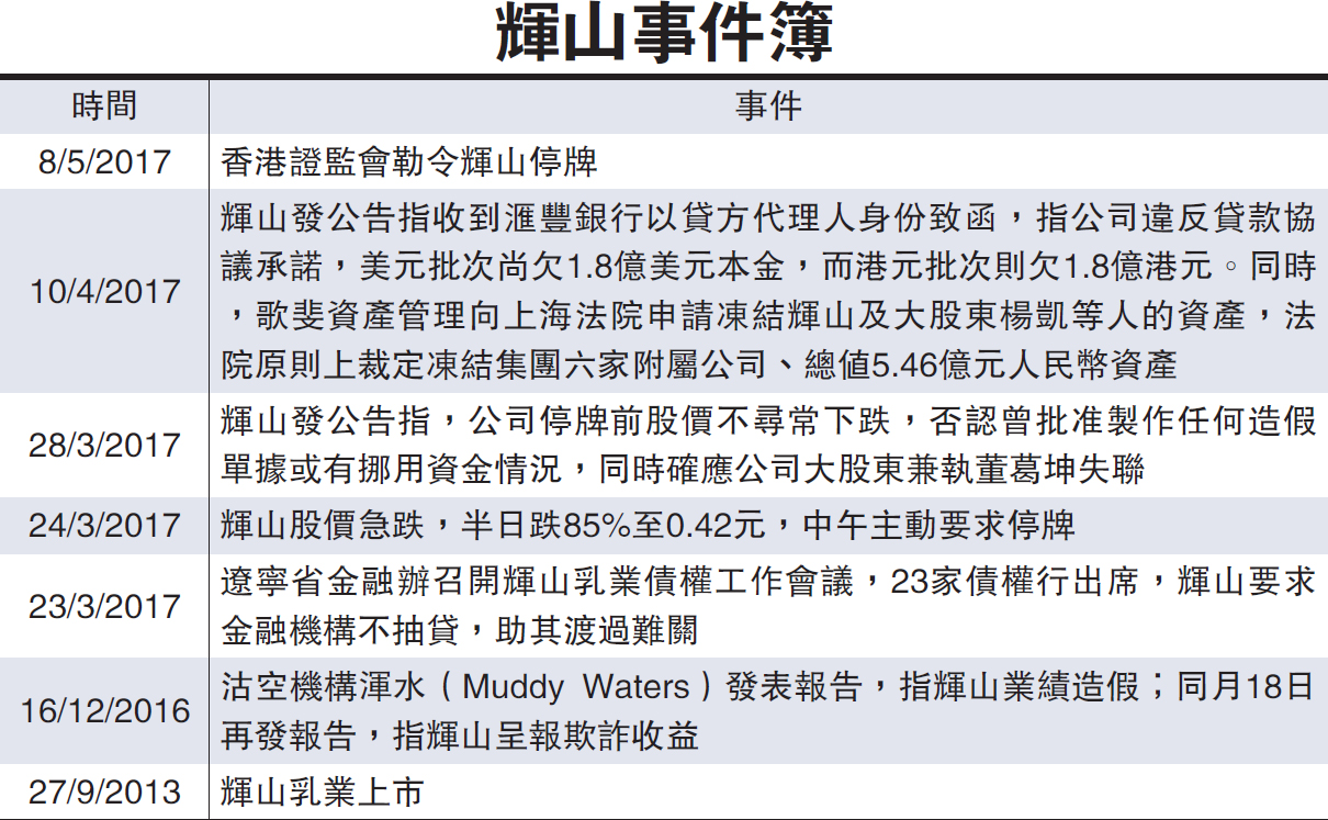 □輝山乳業(06863)遭證監會勒令停牌。港交所通告指,依據上市條例第8(1)條,港交所應證監會指令,於昨日起停止輝山乳業股份之買賣。輝山自3月24日起,因股價暴跌主動向港交所要求短暫停牌,其間爆出有主要股東失聯,公司資產遭凍結等消息。公司昨晚發出公告,除提及被停牌一事,亦透露一筆達5093萬美元(約3.97億港元)的融資欠款,被中銀澳門要求於本月16日前償還。市場人士分析,證監要求停牌的原因廣泛,若當中涉及公司本身帳目問題,相信短時間難解決,或面臨長期停牌的可能。\大公報記者 陳詠賢