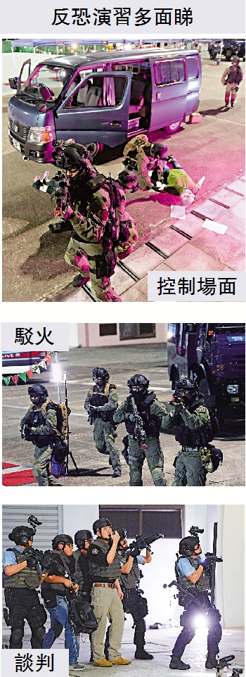 【大公報訊】記者陳卓康報道:九龍灣昨晚發生「恐襲」及「挾持人質」事件,一群蒙面恐怖分子驅貨車撞向人群,更挾持多名人質,與警方駁火連場,談判專家游說無效後,警方派出王牌飛虎隊攻堅,拆彈專家更即場引爆炸彈,成功營救人質,警隊一連四日代號「堅盾」大型反恐演習亦來到尾聲。警方強調,目前未有情報顯示香港是恐襲目標,但國際形勢複雜多變,有必要做足準備。
