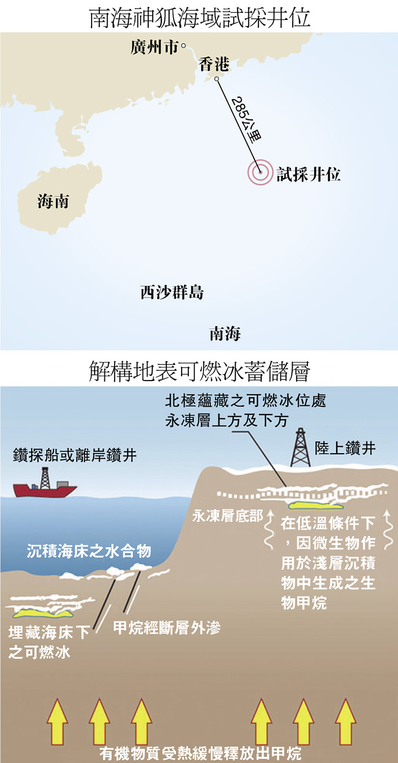 【大公報訊】記者毛麗娟報道:可燃冰是甲烷和水分子在低溫高壓下結合之化合物,燃燒後僅生成少量二氧化碳和水,污染比煤、石油、天然氣小很多,能量卻高出十倍,是新型清潔能源表表者。據測算,中國南海可燃冰資源量為700億噸油當量(按標準油熱值計算各種能源量之換算指標)。