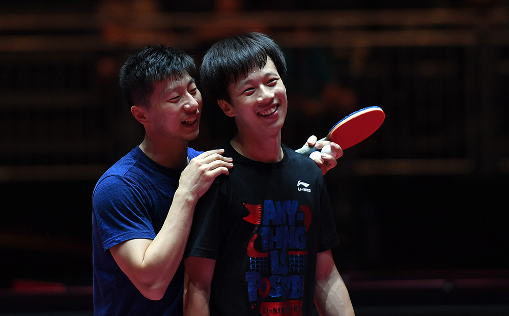 圖:中國隊選手馬龍(左)和林高遠在對打訓練後心情輕鬆 新華社
