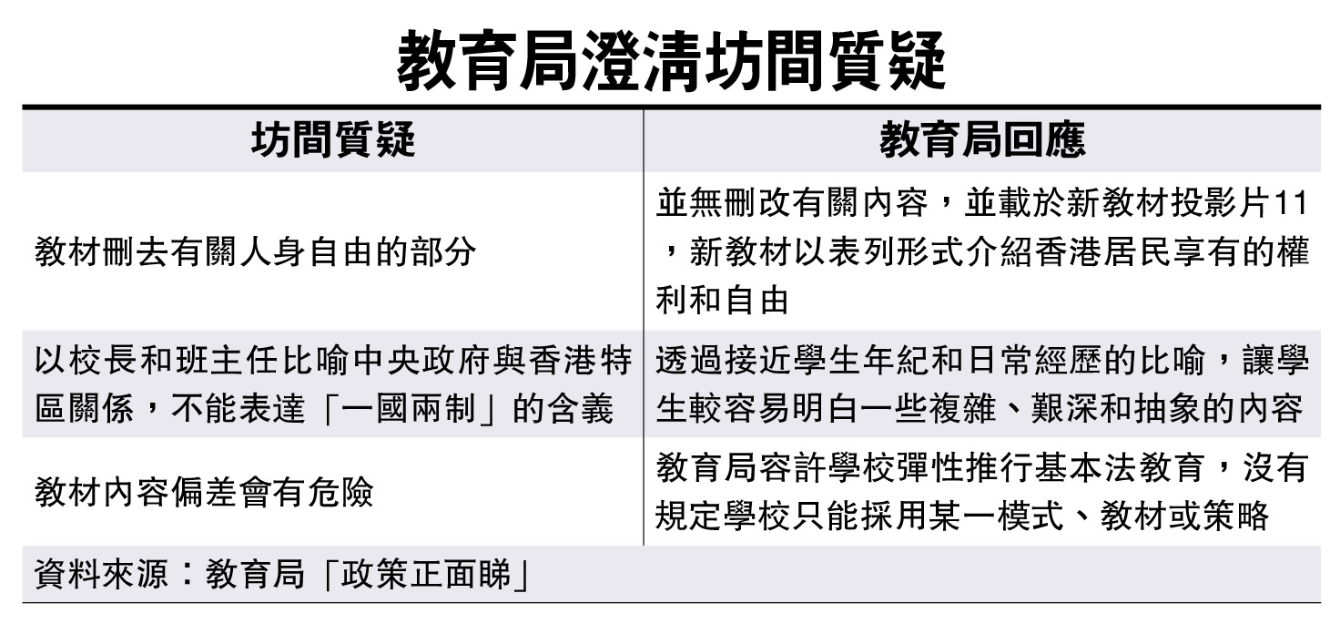 對於以校長和班主任比喻中央政府與香港特區關係,並稱「由哪位老師出任班主任由校長決定」,教育局解釋,比喻旨在透過與接近學生年紀和日常經歷的表達手法,讓學生較容易明白一些複雜、艱深和抽象的內容,這種類比的教學手法亦為其他科目在教學上常用,有利學生對某些重點的理解,不應被當作為描述某課題的全部內容。基本法推廣督導委員會委員、中學校長蔡若蓮出席同一電台節目表示,教材只是例子,不會變作課程,相信老師明白僅供參考,會按學校各自的學習目標及重點,自行作校本補充及刪減。