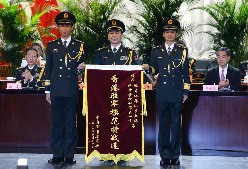 □20年風雨征程,20年春華秋實。慶祝中國人民解放軍進駐香港20周年暨中央軍委授予「香港駐軍模範特戰連」榮譽稱號命名大會,昨日上午在駐香港部隊昂船洲軍營禮堂舉行。中央軍委政治工作部副主任禹光宣讀了中央軍委主席習近平簽署的關於授予駐香港部隊某旅特種作戰一連「香港駐軍模範特戰連」榮譽稱號的命令。中央軍委辦公廳主任秦生祥向特種作戰一連授予獎旗並代表軍委機關講話。解放軍駐港部隊司令員譚本宏表示,「一國兩制」方針在香港取得巨大成功,駐軍一直以來按照基本法和駐軍法履行職責,未來會繼續增強實力,發揮作為保衛香港的「定海神針」作用,同時對香港社會展現「愛港親民」形象。