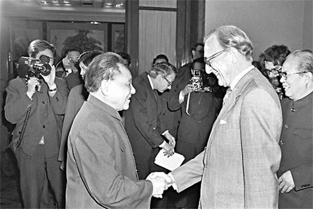 圖:一九八一年四月三日,鄧小平在北京會見英國外交大臣卡林頓,右一為黃華 新華社