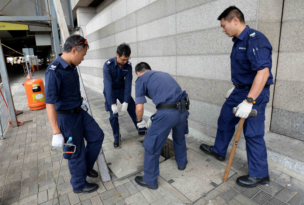 香港眾志等人昨晨發動「小學雞」式的所謂突襲行為後,昨日接近中午,約10名警方重點及搜查組人員拿着圖則,於灣仔會議道及金紫荊廣場一帶,進行安檢,其間人員帶備鐵鈎、照妖鏡、電筒等裝備,揭開渠蓋搜查,並細心查證地底及坑渠是否有可疑物品,再用電筒照遍渠內的角落,被檢查過的渠井口,會以特定黑色膠貼即封條「封閉」渠蓋,方便辨識,現場消息稱,若有關的封條曾被撕過或移動,警員會立即重新搜查以策安全。