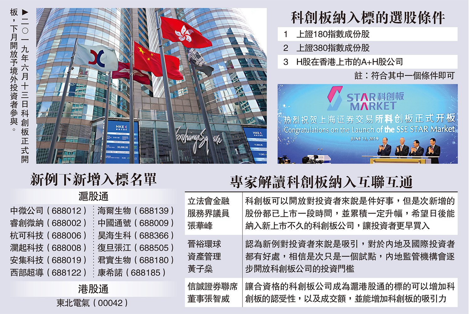 立法會金融服務界議員張華峰表示,科創板開放對投資者來說是件好事,將會吸引不少外資基金或投行,通過港股通投資科創股,以至日後在港將有科創股基金推出。不過,認為是次新增的股份必需要是指數成份股,並且都已經上市一段時間累積一定升幅,希望日後能讓新上市不久的科創板公司都能被納入滬股通內,讓投資者更早買入。