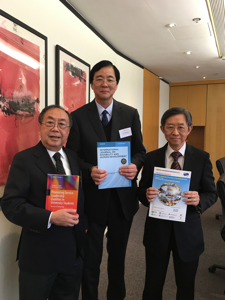 圖:香港服務領導與管理學院主席鍾普洋(左起)、香港理工大學協理副校長石丹理、經綸慈善基金董事黃啟民 大公報記者林靜文攝