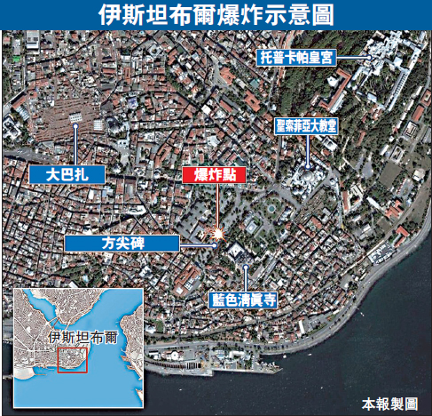 【大公報訊】綜合美聯社、法新社及英國《衛報》報道:土耳其伊斯坦布爾著名地標「藍色清真寺」對開廣場,12日早上發生自殺式炸彈襲擊,造成至少11人死亡,其中包括9名德國人及2名韓國人,另有14人受傷。土耳其指,此次襲擊者是一名來自敘利亞的28歲青年,屬於「伊斯蘭國」(ISIS)成員。