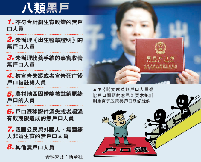 【大公報訊】中國國務院辦公廳日前印發《關於解決無戶口人員登記戶口問題的意見》,《意見》提出了解決無戶口人員(「黑戶」)登記戶口問題的指導思想、基本原則、任務目標和具體政策措施。《意見》要求加強戶口登記管理,全面解決無戶口人員登記戶口問題,切實保障每個公民依法登記一個常用戶口。依據意見精神,因超生而成為「黑戶」的,今後亦可按照流程實施戶口登記。