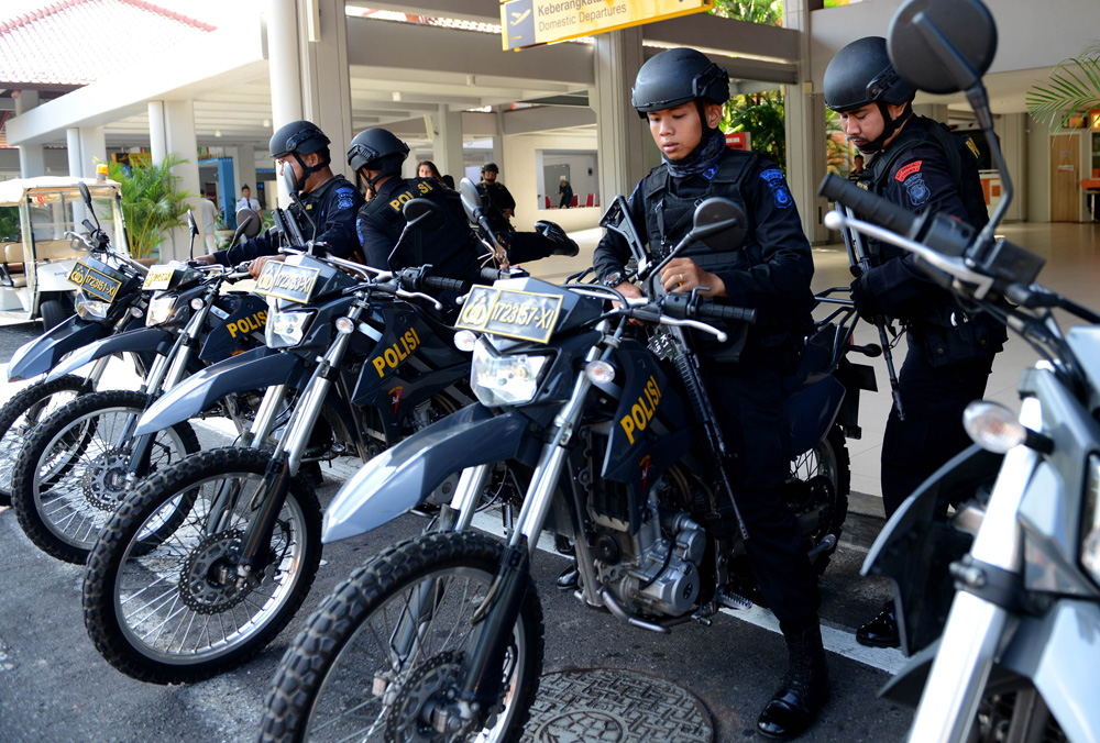 圖:印尼特警15日準備在峇里島機場巡邏/法新社