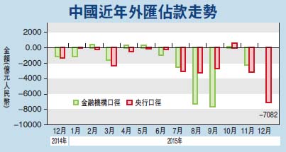 【大公報訊】記者倪巍晨上海報道:去年十二月中國央行口徑外匯佔款降幅達到創紀錄的7082億元(人民幣,下同)。在人民幣貶值壓力大的前提下,資本仍面臨流出壓力,外匯佔款料延續低位震盪格局。
