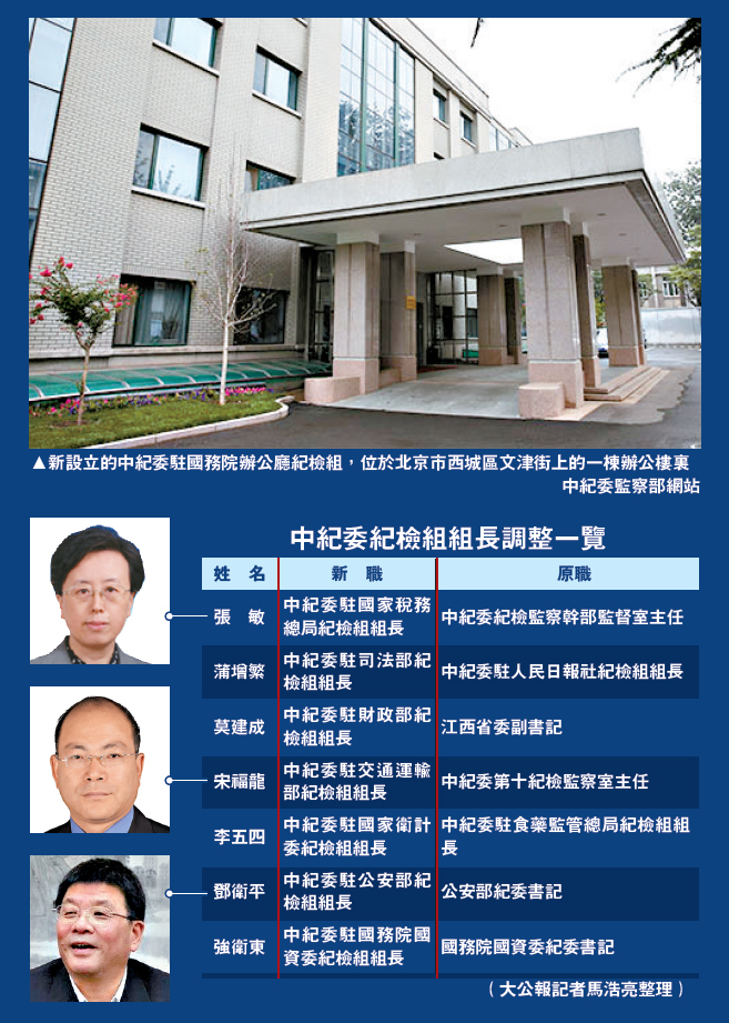 在本輪調整中,中紀委的派駐機構統一規範名稱設置,如原國務院國資委、公安部原本都設有紀委,此次統一改設為紀檢組。與之相應,原國資委紀委書記強衛東、公安部紀委書記鄧衛平,都轉任中紀委駐兩家機構的紀檢組組長。