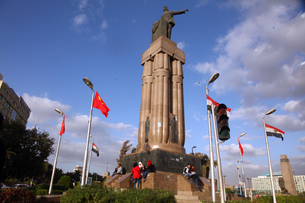 圖:中國國旗與埃及國旗懸掛在埃及開羅街頭/新華社