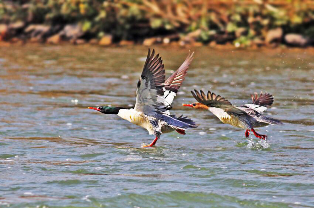 4隻珍稀國寶級物種中華秋沙鴨近日在河南丹江濕地自然保護區被發現,這是首次在丹江河畔拍攝到中華秋沙鴨的身影。中華秋沙鴨是第三世紀冰川期後殘存下來的物種,距今已有上千萬年,全球僅存1000多隻,是比揚子鱷還稀少的國際瀕危物種,屬國家一級重點保護的稀有鳥類。