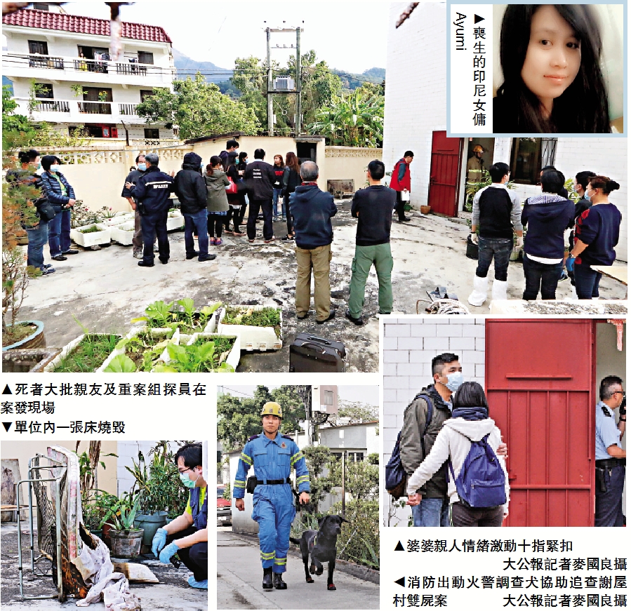 □八鄉謝屋村昨晨揭發主僕雙屍命案。一名不良於行長期?床的婆婆,昨晨被女兒發現倒斃於睡房的醫療床上,一直照顧她的印尼女傭亦命喪房內地上,兩人身上有被火燒過的傷痕,警方初步調查將案件暫列作屍體發現案處理,正調查奪命火源頭和兩人死因。據現場消息稱,兩人喪生已一段時間,初步疑婆婆的床鋪失火,女僕欲救火反遭火燒傷和濃煙奪命,警方事後檢走一張床褥燒穿的床鋪,一部熏黑的手機和房內大批物品作進一步調查。/大公報記者 麥國良