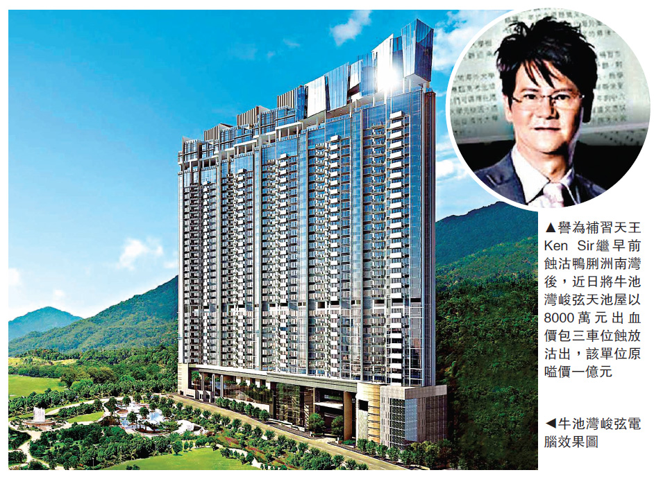 □樓市跌勢加劇,名人起勢出貨。現代教育創辦人、人稱補習天王的Ken Sir(吳錦倫),近期頻頻放血減磅,繼早前蝕沽鴨?洲南灣後,牛池灣峻弦天池屋喪劈2000萬元以8000萬元出血價放售,若此價賣出連使費痛蝕7球,為其歷來最傷的蝕讓個案。/大公報記者 梁穎賢