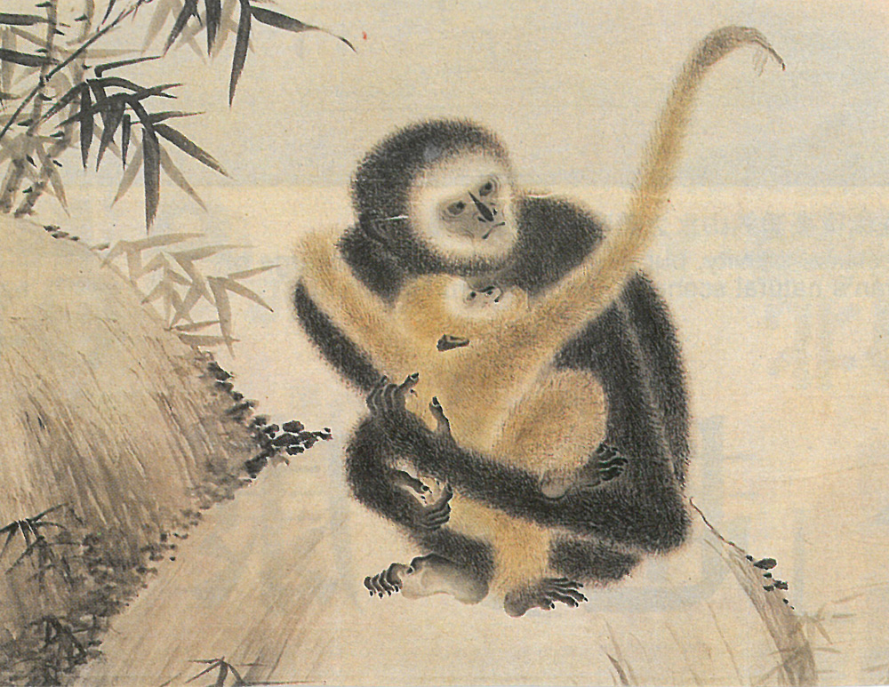 在博物院曾見明宣宗繪《戲猿圖》(附圖為局部),母猴手抱長臂小猴,寫實手法濃,用筆細緻,設色和諧,姿態神情逼真,活靈活現。獮猴應為當時皇宮中所飼養;以一個古代皇帝而言,觀察力和技法皆很到家。