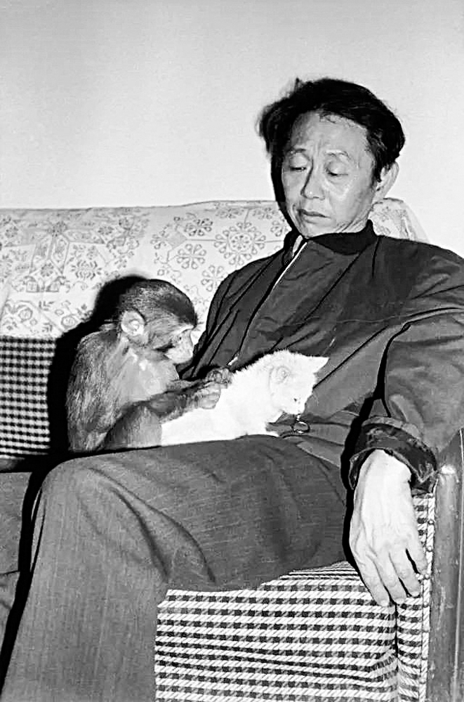 圖:黃永玉和家中的猴子與貓在一起\資料圖片