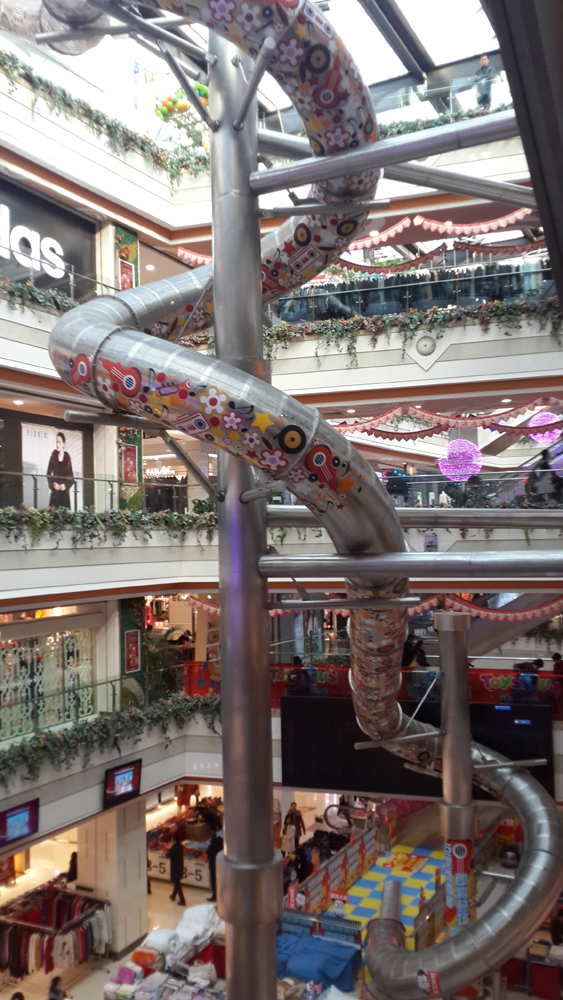 「巨型滑梯」位於上海巴黎春天浦建店。盤旋蜿蜒的「巨型滑梯」吸引了不少顧客駐足觀看,商場負責人透露,該滑梯採用不銹鋼材料,起點設在商場五樓,終點則在商場一樓,總高度約有20米,是上海首個商場內置「巨型滑梯」。