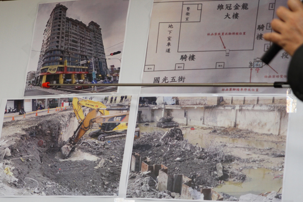 台南市政府工務局長吳宗榮表示,根據警察局訪查得到的資訊,林女最可能在的位置應該是在A棟靠近永大路騎樓的一根柱子附近;下午以機具開挖,在地面下2.6公尺處找到林女遺體。