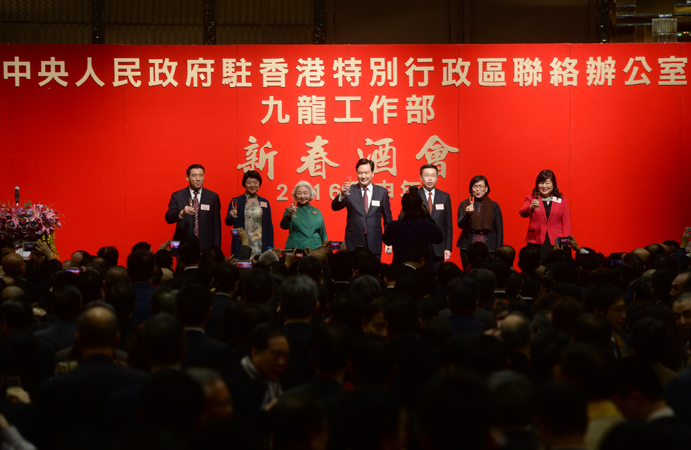 中聯辦九龍工作部昨日舉行新春酒會,九龍工作部部長何靖和其他三位副部長王小靈、盧寧、劉國強陪同主禮嘉賓出席酒會。港區全國人大代表、全國政協委員、立法會議員,以及九龍各主要社團領袖,逾千人齊賀新春。酒會現場充滿了喜慶、熱烈、友好、祥和的氣氛。