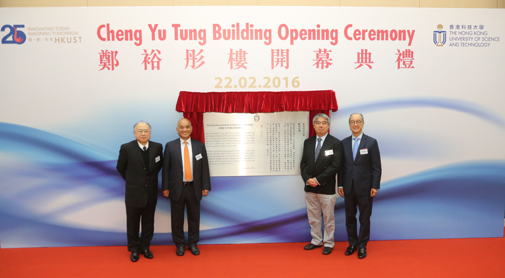 香港科技大學昨天舉行鄭裕彤樓開幕禮,儀式由科大校董會主席廖長城(圖左起),新世界發展有限公司、周大福珠寶集團有限公司主席及鄭裕彤慈善基金董事鄭家純,周大福慈善基金主席及鄭裕彤慈善基金董事鄭家成,科大校長陳繁昌主持。鄭裕彤樓樓高八層,面積達一萬平方米,教研設施包括先進顯示與光電子技術國家重點實驗室、機器人研究所以及由科大與微信聯合成立的「微信─香港科技大學人工智能聯合實驗室」等。