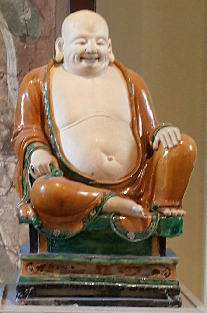 彌勒佛,俗稱笑佛,海外好些華人對他崇敬有加,華人區普遍稱他為彌勒菩薩。他面容慈祥,滿臉堆笑,在眾生面前袒露胸膛,不拘小節。佛教中,「現在佛」為釋迦牟尼,「過去佛」是燃燈古佛,「未來佛」就是彌勒佛。站在笑佛面前,很覺親切,哀愁一掃而空。魏晉三彩彌勒佛像的彩瓷是帶有色彩裝飾的瓷器,乃相對於素瓷而言。由於中國彩瓷歷史悠久,及至明、清兩代,景德鎮的彩瓷品種已多至數十種或百種以上。