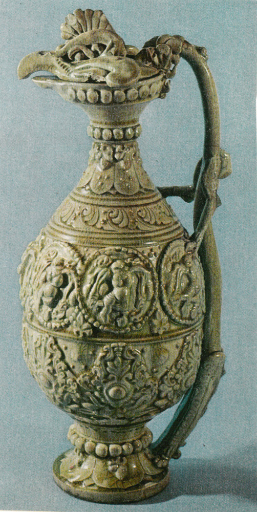 至於鳳首,有前輩專家考據,謂應受古波斯文化影響。南北朝時,大多作雞首者,只堆塑於前肩;唐代此青釉壺既把鳳首作壺蓋,同時亦把彎曲鳳喙作壺嘴上方,十分特別。