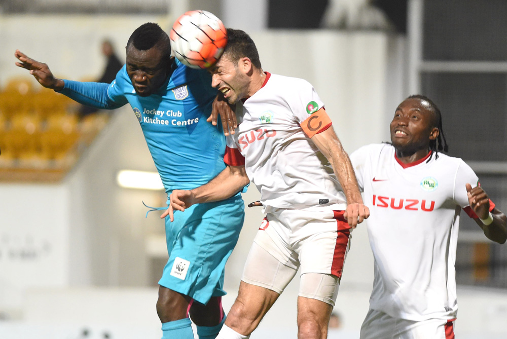 圖:傑志的艾力士(左)與南區的迪亞斯(中)爭頂皮球\大公報記者李恆基攝