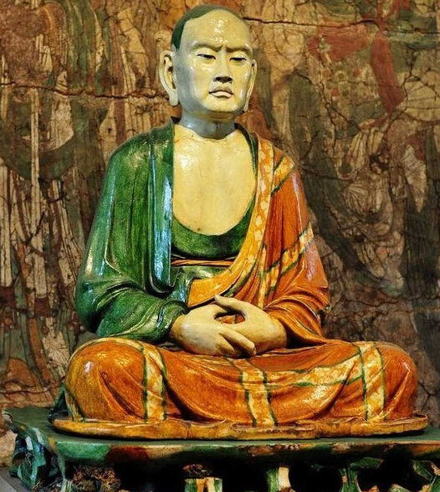 大英博物館收藏的這一尊遼三彩羅漢像,蹙眉沉思,是憐惜眾生所受苦難,堅毅卻寧靜,雙唇閉上,結禪定印的雙手,顯示內心的祥和和禪意,甚至肌膚的彈性也表露無遺。羅漢的這種表情,也是在弘揚佛法。北魏後期的佛像是懸裳座;唐代佛像是坐蓮座,袈裟下擺;及至遼代八佛窪羅漢像,袈裟紋路更見豐富。