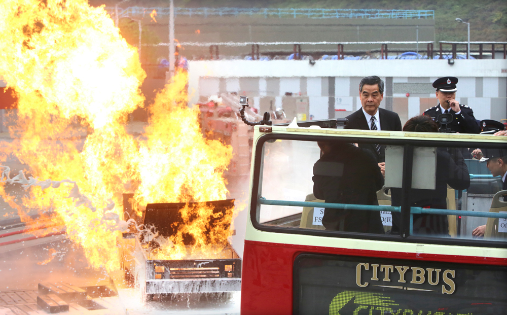 梁振英其後與官員登上開篷巴士,參觀學院內各項實境訓練設施示範,包括船隻水上纜索拯救、高空訓練塔上吊運傷者、大型車禍現場救援、密閉式室內煙火特性訓練、油庫、行車隧道、油站以射水或泡沫救火,鐵路事故的傷者分流、坍塌搜救人員及犬隻示範等。「災場」火勢猛烈熱力逼人,梁振英不時站起張望,聽取消防處人員介紹。