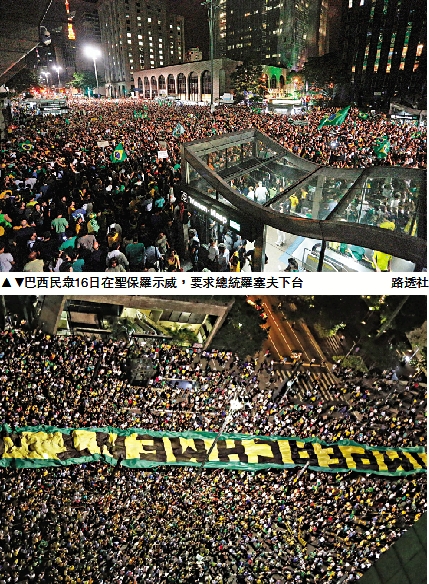 圖:巴西民眾16日在聖保羅示威,要求總統羅塞夫下台/路透社