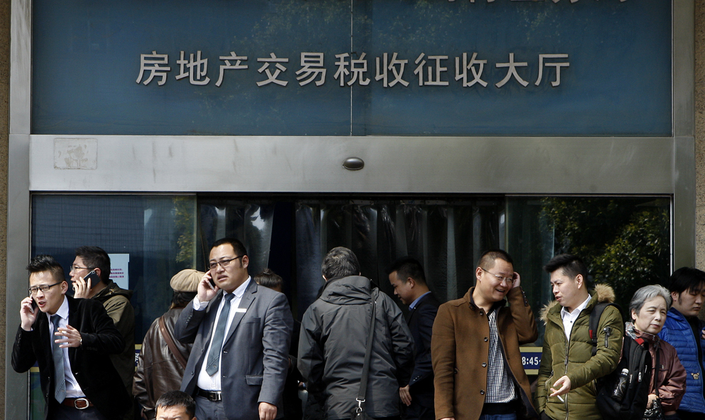 圖:上海閔行房地產交易中心大門口昨日聚集?前來辦理業務的市民