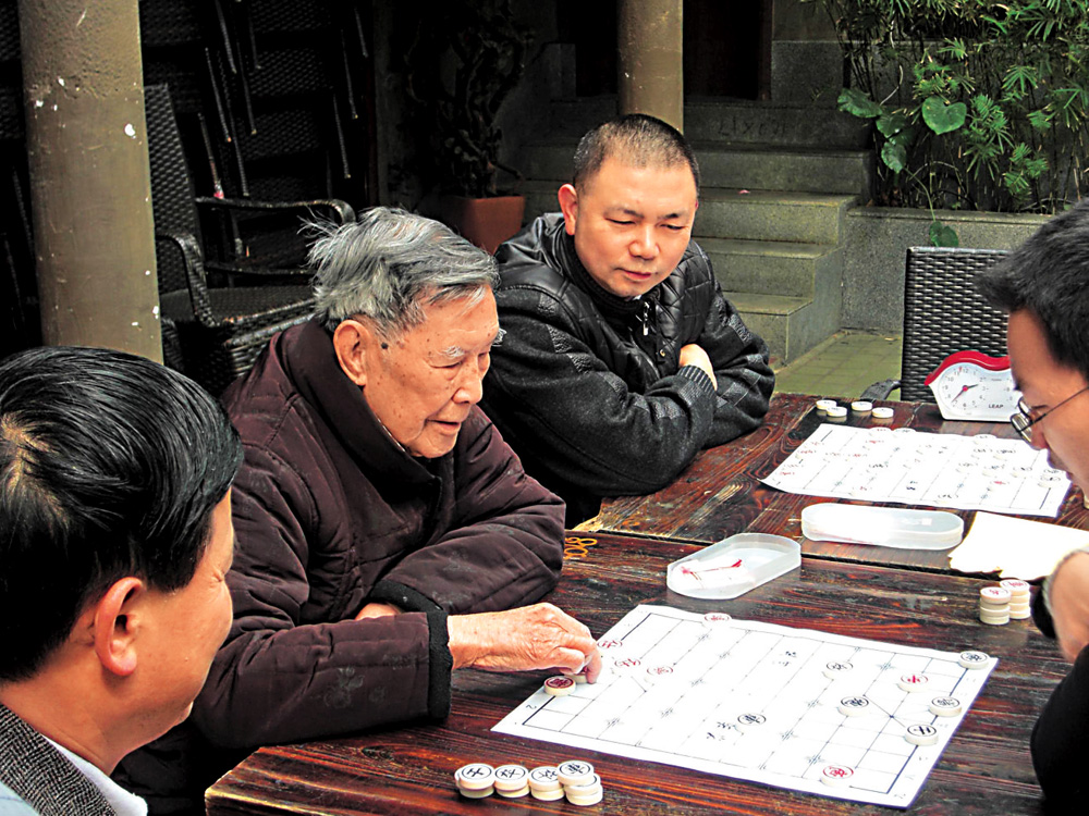 圖:陳松順(圖左中間下棋者)晚年出席棋藝活動 網絡圖片
