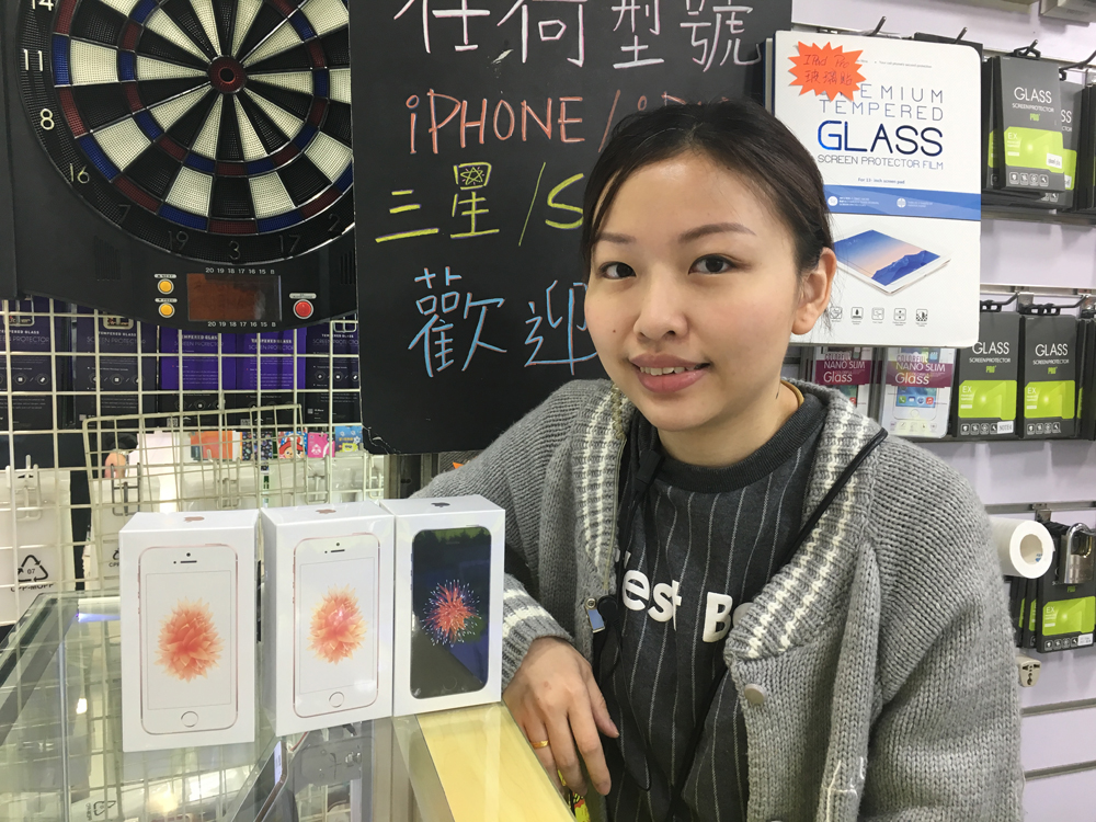 圖:先達手機店的店員Chloe稱,iPhone SE炒賣空間有限 大公報記者吳卓峰攝