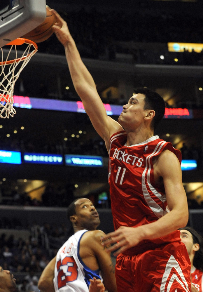 圖:這是姚明(右)在NBA火箭比賽中入樽的資料圖片\中新社