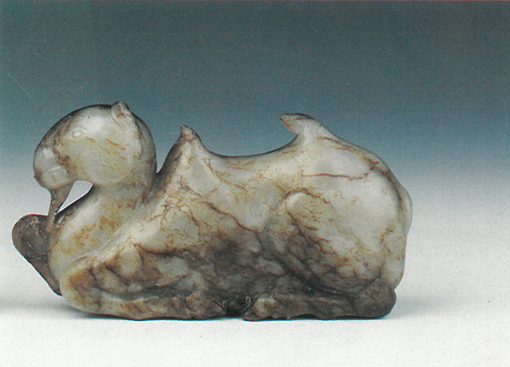 從新石器時代各地原始文化,直至春秋戰國時期,均未見發現有玉琢駱駝出土。漢代才出現立體玉雕雙峰駱駝(立姿,長十六點五公分)。《玉雅》載:「金史世宗紀,大定二十六年,皇孫生,章宗進玉雙駝鎮紙。」那時玉駱駝比玉馬少很多。漢代張騫出使西域烏孫、大宛、月支、大夏等國,把絲織品和鐵器等輸至西域。迄宋、元兩代,玉駱駝仍較少,且雙峰竟誇張成尖峰形(見附圖),坐姿卻似狗。