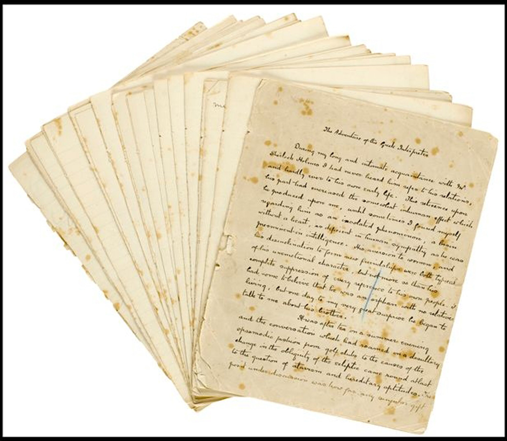 據了解,此次的拍賣品中,陳列有記述福爾摩斯的哥哥邁克羅夫特首度登場的《希臘語譯員》的手寫草稿,以及《巴斯克維爾的獵犬》和另一份《松橋探索》的手稿。由於《巴斯克維爾的獵犬》部分手稿已散佚或被盜,因此拍賣中一份講述福爾摩斯與助手華生討論案情的手稿,就更顯珍貴。