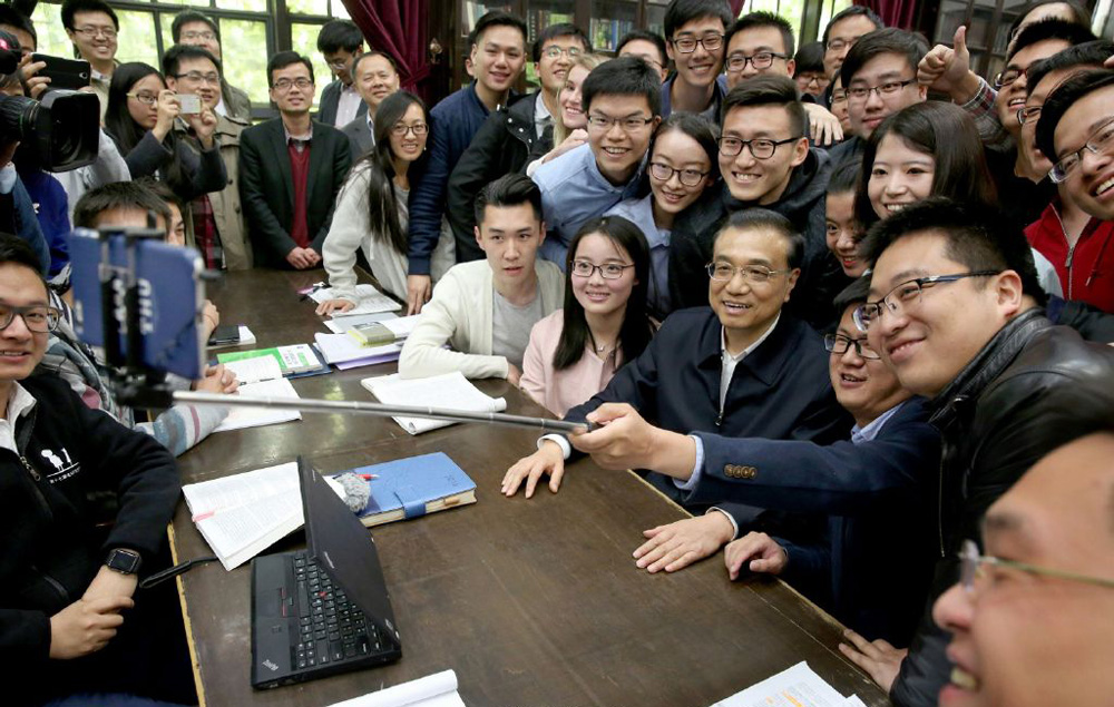 圖:在清華大學圖書館,李克強和清華的同學們一起玩自拍,科技感十足