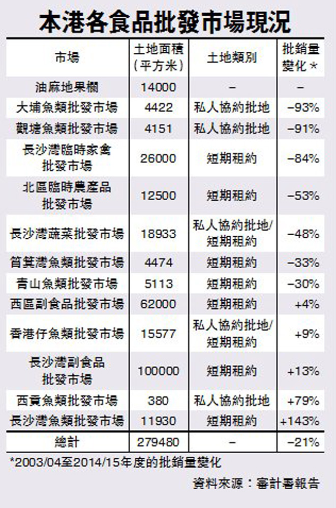 □本港房屋用地短缺,但審計署發現,佔據市區黃金地段的批發市場被閒置或用作非擬定用途,五個分布於長沙灣、觀塘、大埔、北區的批發市場,批銷量在過去十年暴跌48%至93%,其中長沙灣蔬菜批發市場、長沙灣副食品批發市場與觀塘魚類批發市場用地,當局雖已打算改作房屋用地,但搬遷市場計劃拖拉五年無進展,無法釋出地皮。油麻地果欄早於1969年由政府決定搬遷,但47年來只聞樓梯響,針對果欄阻塞和噪音投訴不絕。審計署再次要求政府落實推展油麻地果欄搬遷計劃。\大公報記者 曾敏捷