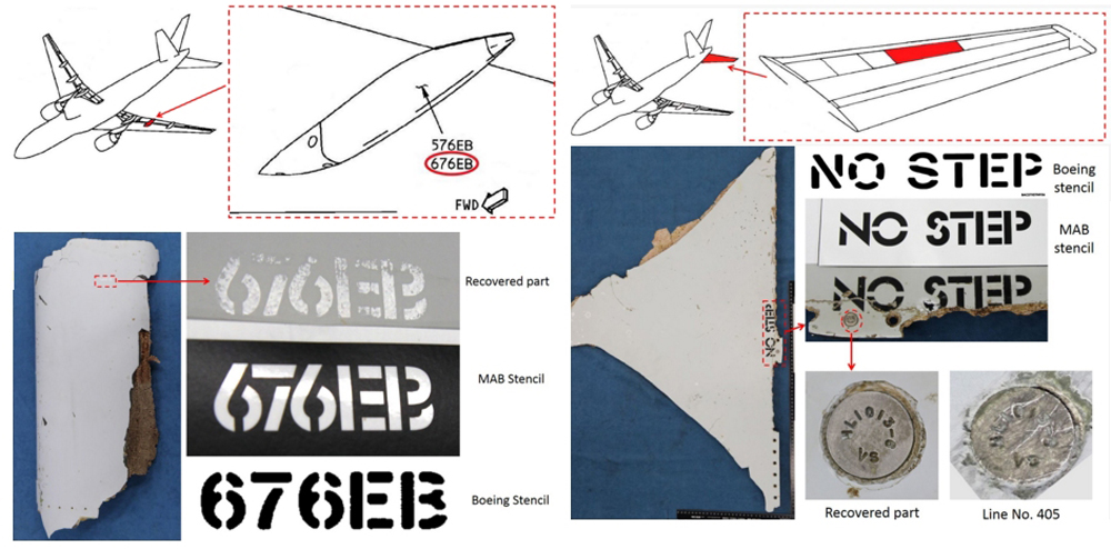 澳洲交通局在報告中詳細解釋說,這兩塊殘骸上的噴漆為調查員提供了線索。經過仔細勘察,首塊殘骸是波音777的襟翼導軌整流罩,其顏色,以及上面數字編號「676EB」,均證明來自馬航。第二塊殘骸上是波音777的水平尾翼,上面印有「不准踩踏」的字體,也與馬航所使用的噴字完全一致。不過,澳方在報告總結中,仍然只謹慎地稱,這兩塊殘骸「幾乎肯定」來自MH370。