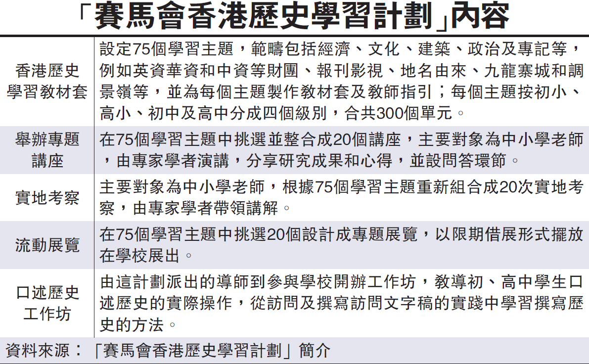 嶺南大學昨日上午舉行「賽馬會香港歷史學習計劃」啟動儀式,吳克儉及香港賽馬會慈善事務部主管陳文端主禮。該計劃為期三年,獲香港賽馬會慈善信託基金捐贈1483萬元。為使中小學生有豐富資源認識香港史,並令學習過程更為有趣立體,計劃將製作香港歷史學習教材套、舉辦專題講座、實地考察、流動展覽及口述歷史工作坊等。(見附表)
