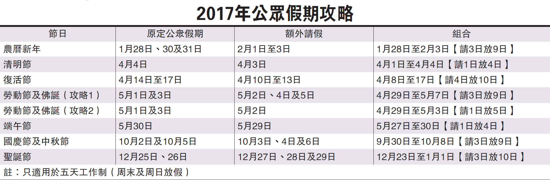 另外,明年10月1日國慶日在星期日,翌日(10月2日)即星期一為補假,加上10月5日(星期四)則為中秋節翌日,因此請假三天(10月3日、4日及6日),便就可從9月30日放至10月8日。至於「最筍」則是聖誕跨年假期,連同2018年元旦假期,只要在12月27日至12月29日請三日假,便可由12月23日(星期六)放至2018年1月1日。
