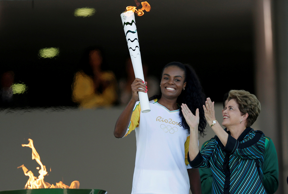 圖:第一名火炬手巴西女排隊隊長克勞迪諾(左),從巴西總統羅塞夫手中接過奧運聖火\路透社