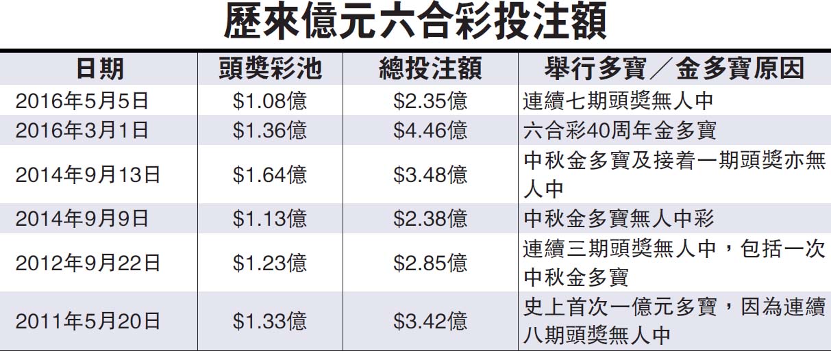 今次「超級六合彩」創下2011年5月以來,億元多寶投注額的新低紀錄,總投注額只有2.35億元(見附表),投注情況遠遜三月的「40周年金多寶」,當時總投注額達到4.46億元。