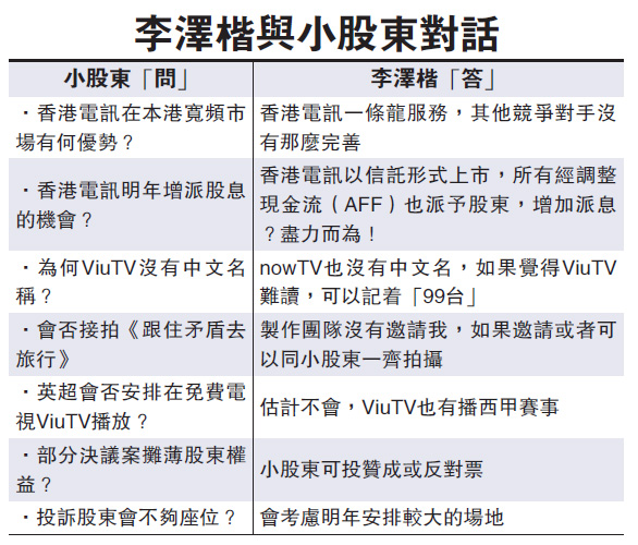 此外,有小股東問及如何面對本港寬頻市場的競爭,李澤楷指出,香港電訊的寬頻光纖網絡覆蓋本港83%家庭,加上可通過相關機頂盒收看免費電視ViuTV、收費電視nowTV及合作方電視廣播(TVB)的節目,其「一條龍」的服務並非競爭對手所能提供。